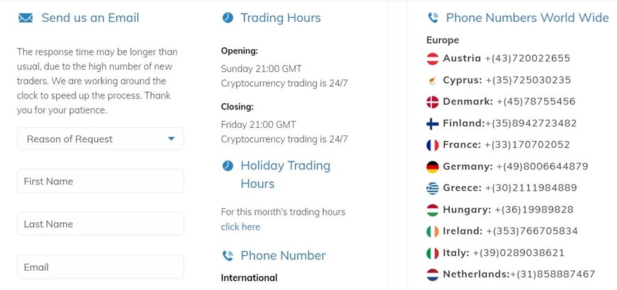 Support is offered from Sunday at 21:00 to Friday at 21:00 for most markets, but cryptocurrency support is available 24/7 as that market never closes.