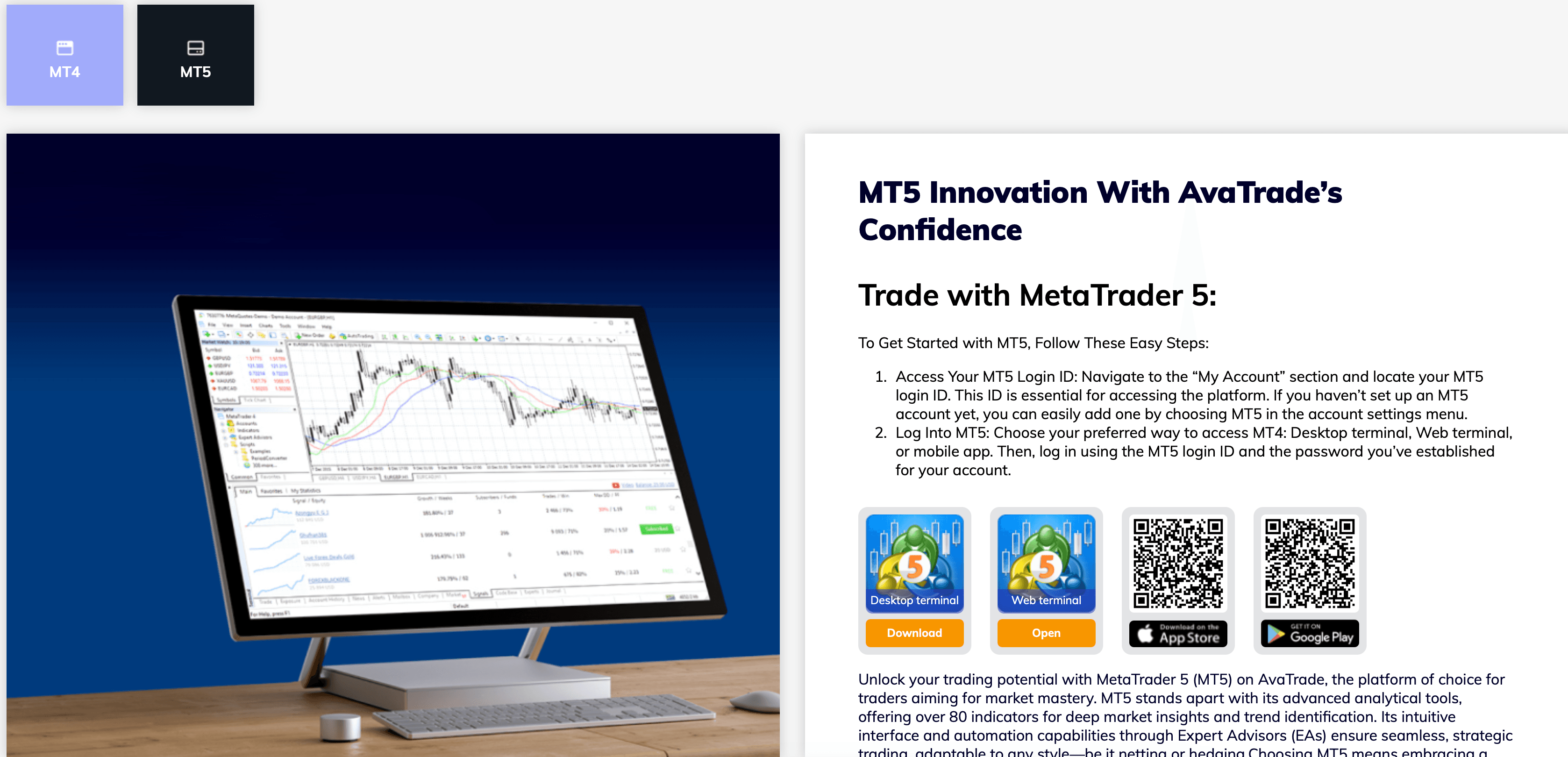 The MT5 Web Platform at Avatrade. Image via Avatrade.com MT5 has the same look and feel as MT4, but was created as a more powerful platform, particularly when it comes to its back testing functionality and capabilities. It uses the updated MQL5 programming language and offers more powerful features as you can see: