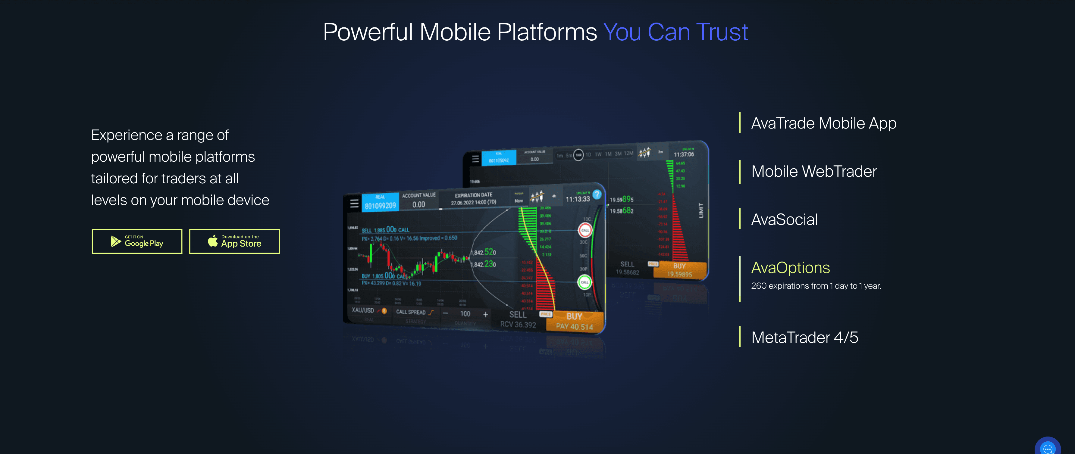 Because the MT4 and MT5 platforms don’t work with the options available at AvaTrade they created their own proprietary AvaOptions platform. AvaTrade offers options on forex pairs, gold, and silver. If it weren’t for the AvaOptions platform it would be a complex procedure to trade options.