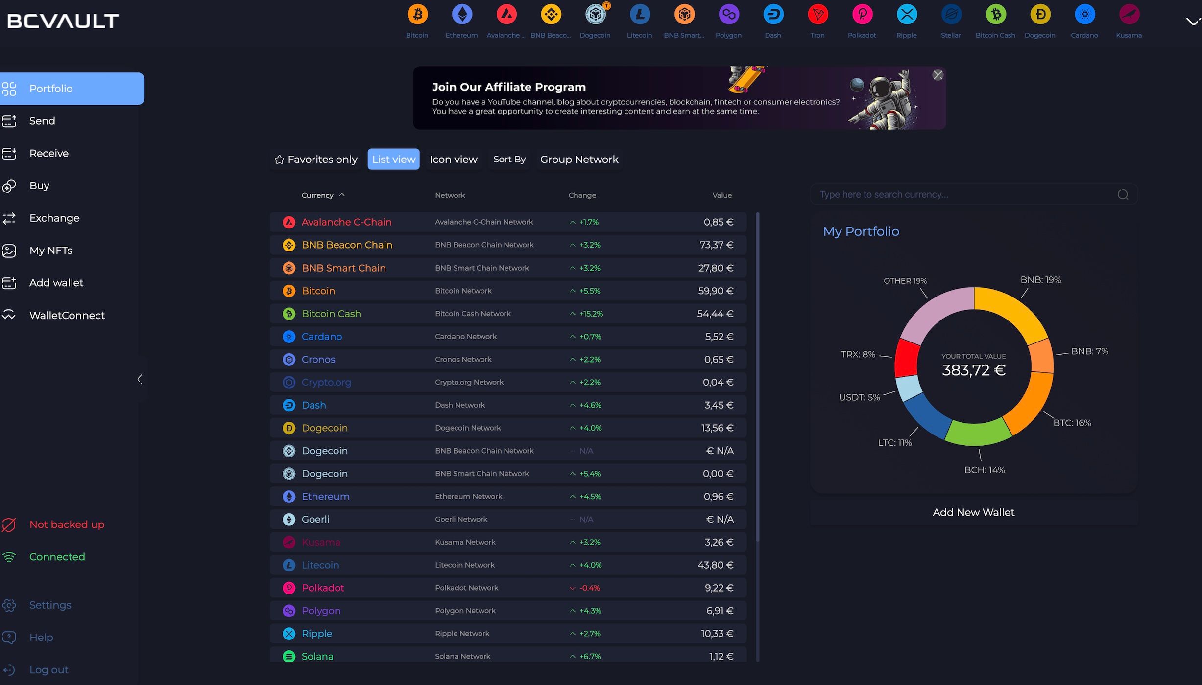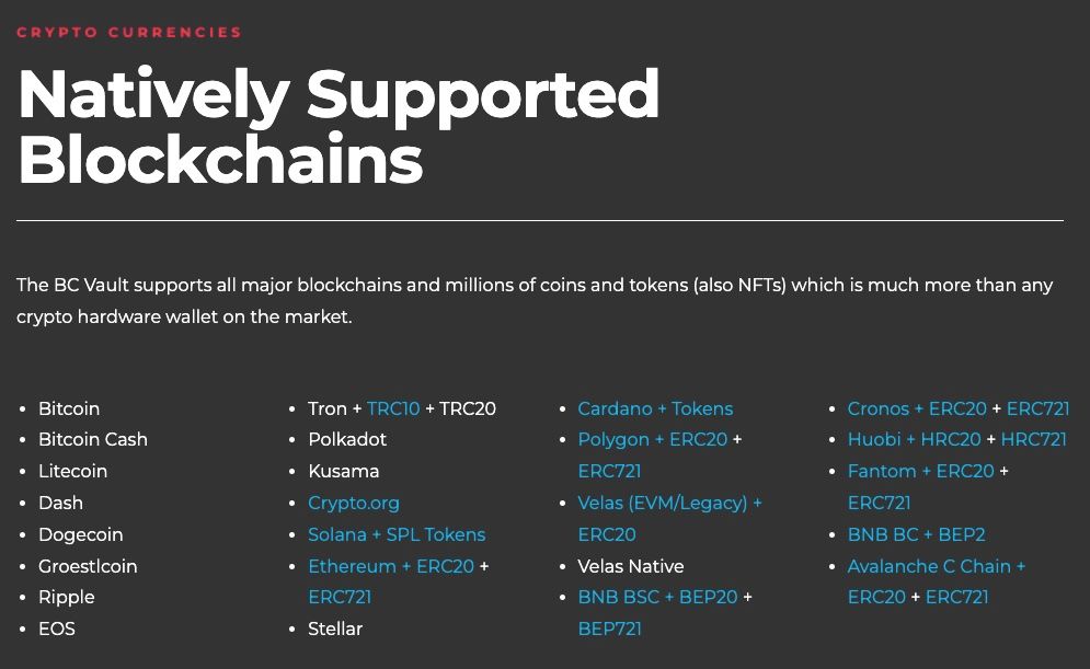 BC Vault supports all major blockchains and millions of coins, tokens, and NFTs. The Vault outperforms competing wallets in this regard, making the Vault great for altcoin enthusiasts.