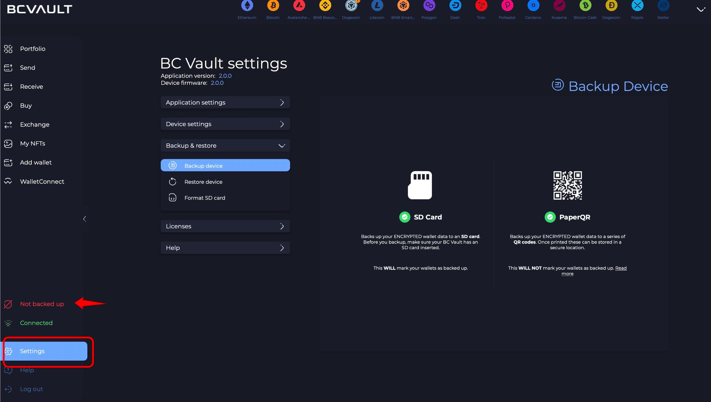 Back up via SD Card or QR Code on PaperUsers also have the option to backup using QR Codes on paper, which can be scanned and accessed using a computer with the BC Vault application loaded onto it and device plugged in should the need to recover a wallet arise.