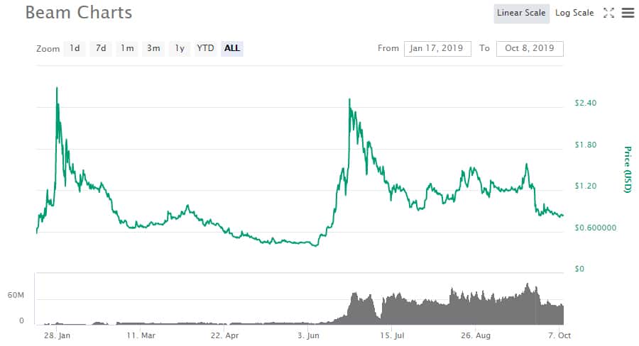 BEAM Price Performance. Image via CMCIt recovered off the all-time low and has spent most of the rest of its existence above $1, but late September saw it fall below that handle, and as of October 8, 2019 it is trading at $0.826316 and is just out of the top 100 cryptocurrencies by market cap as it rests in position number 101.
