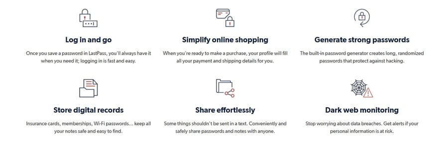 All the features you need from a password management tool. Image via FastPass.com Added security comes from the Dark Web monitor included with each paid LastPass account. Simply turn on monitoring for all the email addresses you want LastPass to keep an eye on. Then any time a monitored address is detected in the database of breached credentials you’ll receive an email from LastPass letting you know about it. Finally, take action to protect any account compromised in a breach. Change your password to ensure peace of mind.