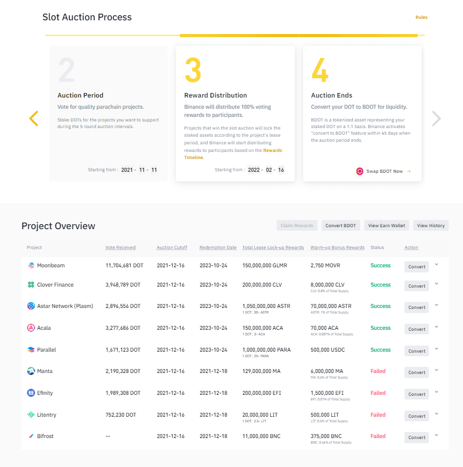 - BDOT tokens: Binance issues liquid BDOT tokens to users representing their staked DOT. It activates the “convert to BDOT” feature within 45 days when the total auction period ends.