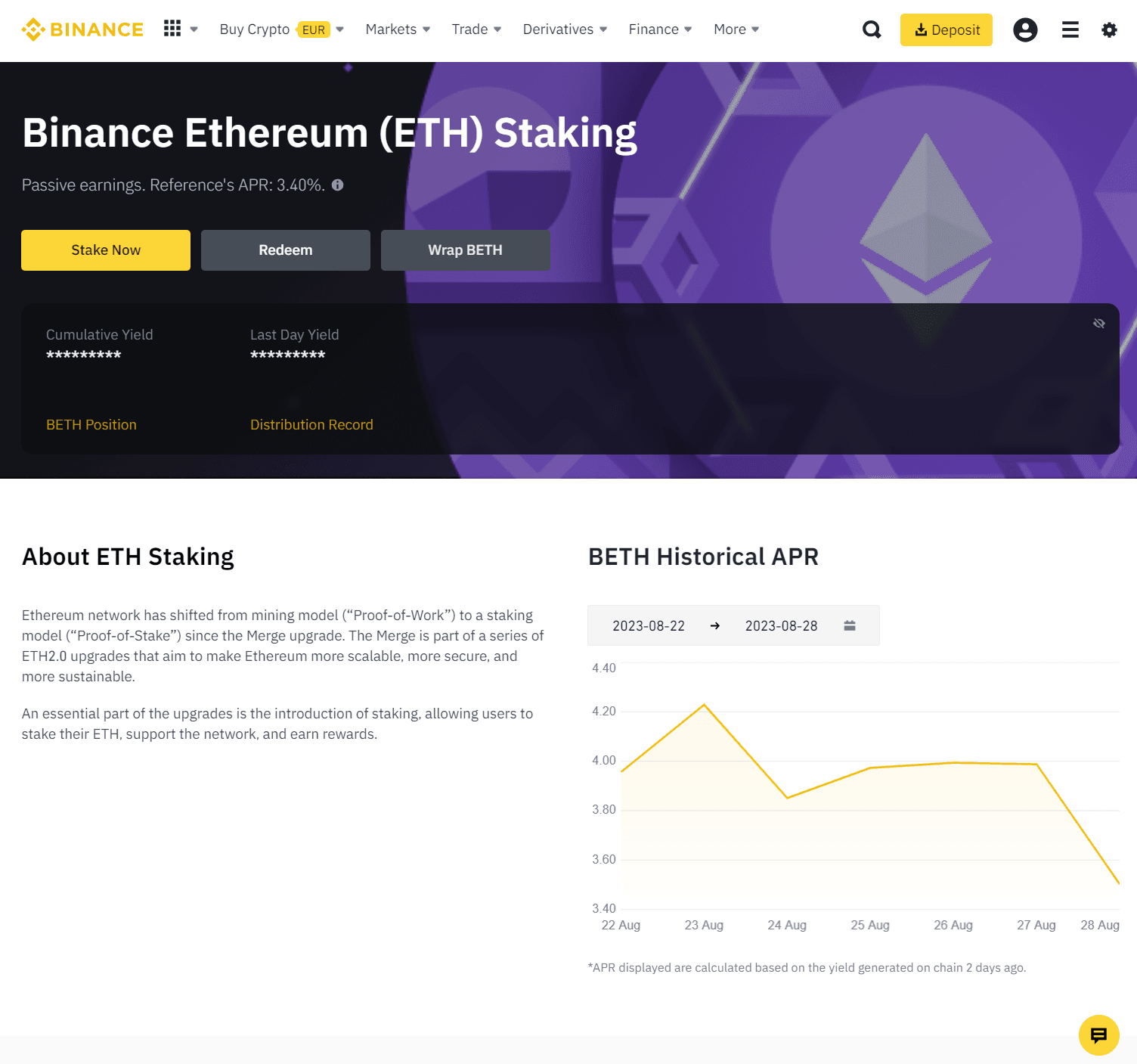 - Staking ETH on Coinbase and Kraken earns 3.26% APY and 4-7% APY, respectively, while the same stake Binance offers 1% APR on ETH deposits.