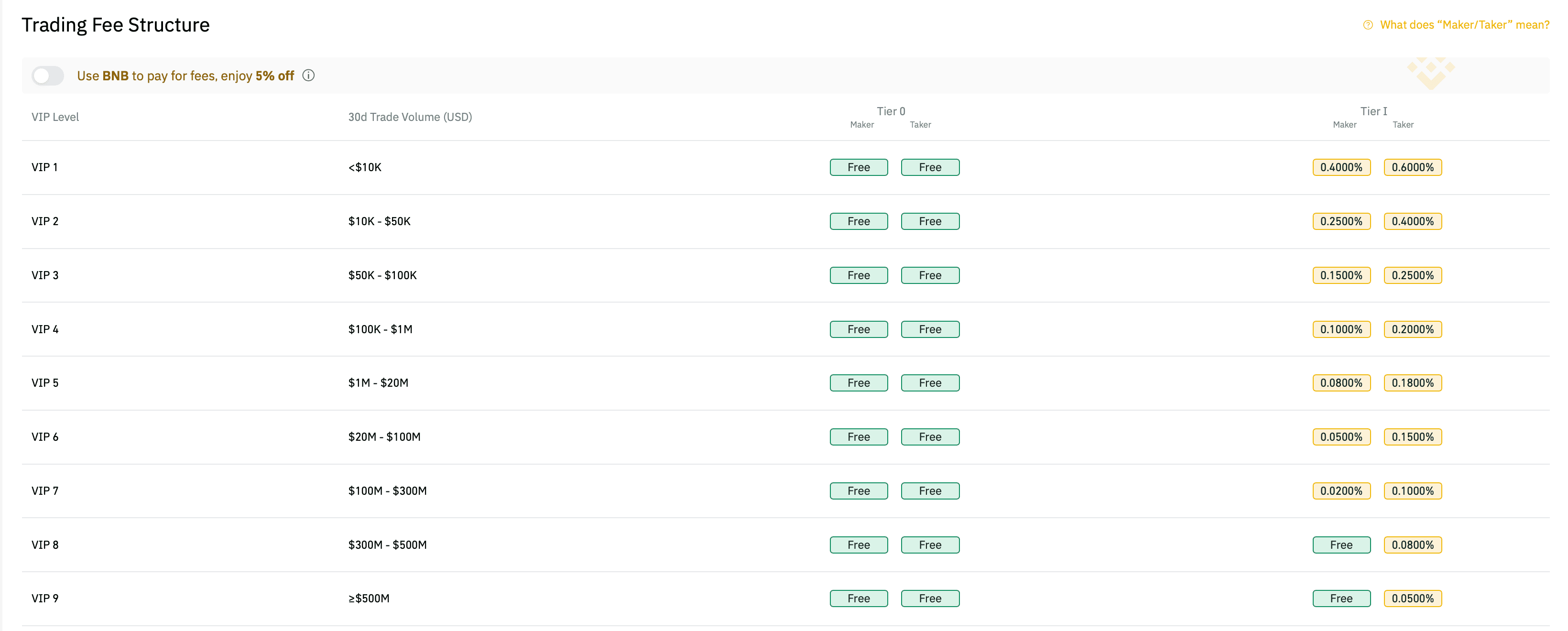 Binance US offers a tiered fee trading structure to their customers, with tier levels being based on a rolling 30-day trading volume. Binance operates on a Maker/Taker fee system, similar to most crypto exchanges.