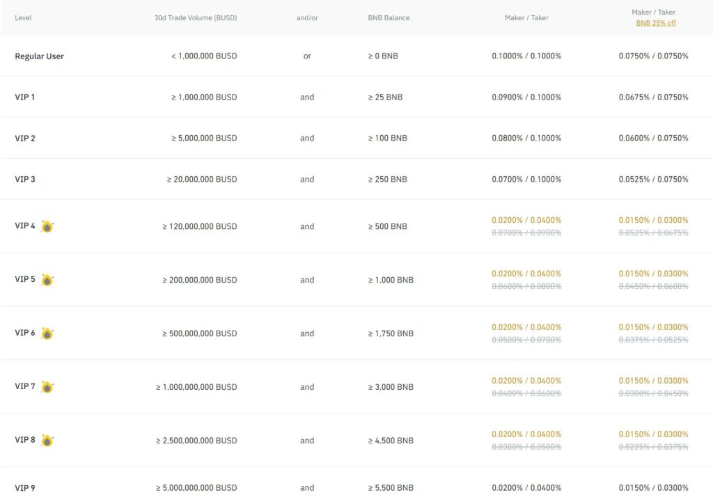 Image via BinanceThe highest fees any trader will pay on Binance is 0.1% maker and 0.1% taker, while the lowest is 0.015% maker and 0.03% taker.