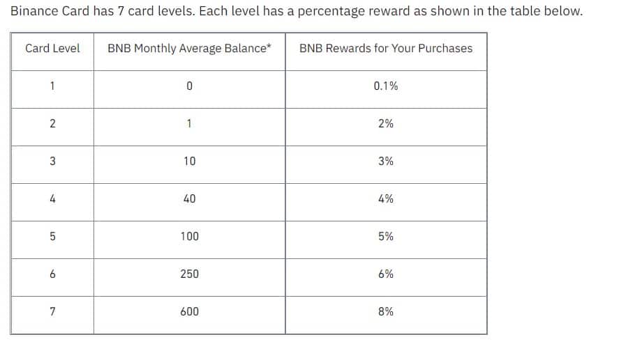 Image via BinanceBinance’s cashback card offers up to a massive 8% cashback, but those perks don’t come cheap, here are the levels of how much BNB you need to hold to earn your BNB cashback.