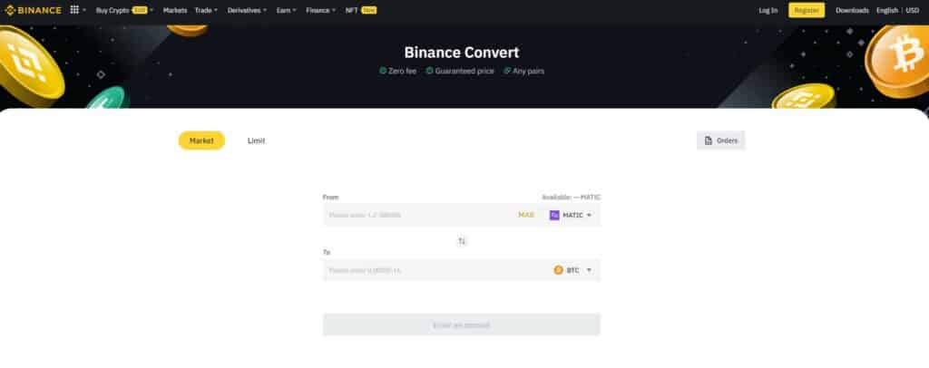 Binance offers multiple different ways for users to trade, from a simple “convert” option that looks like this: