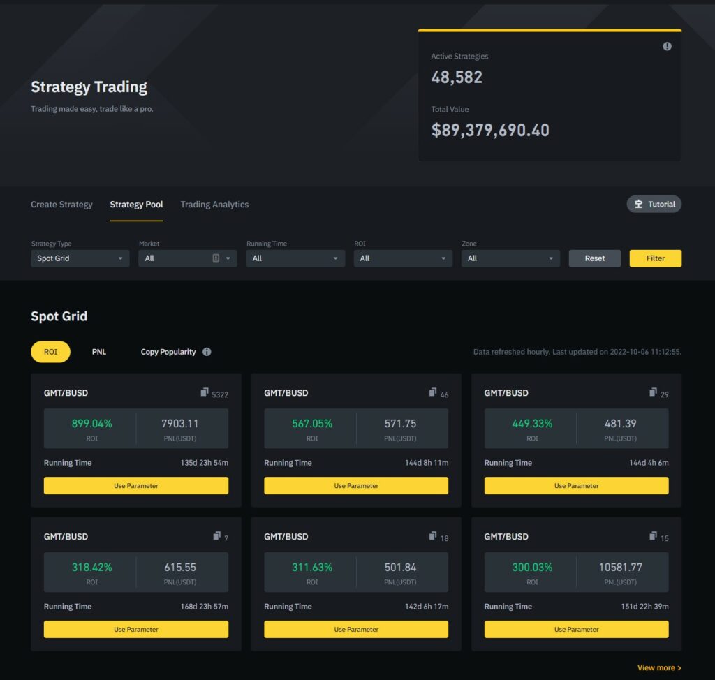 A Look at the Strategy Trading Page on BinanceThis feature provides users with a comprehensive list of Spot and Futures Grid Trading strategies along with each “bot” aka “strategy” performance and popularity so that traders can make informed decisions on which strategy they want to replicate for their own account.
