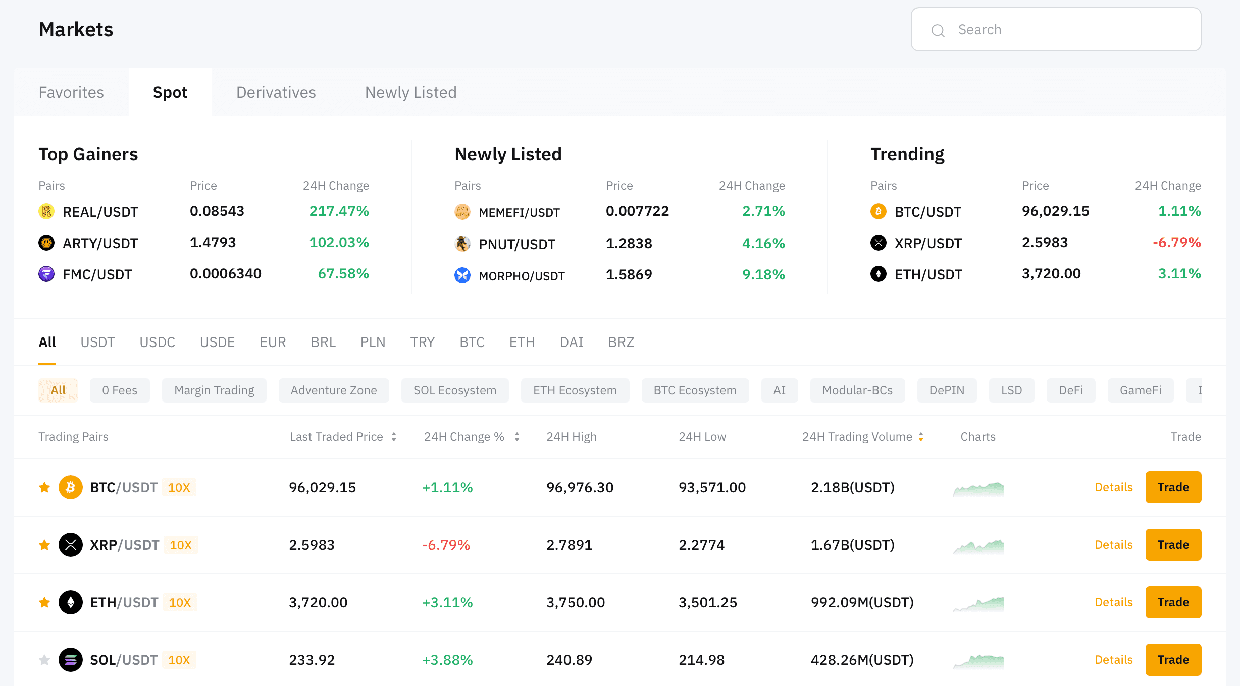 - Multiple tradeable markets such as Spot and Derivatives