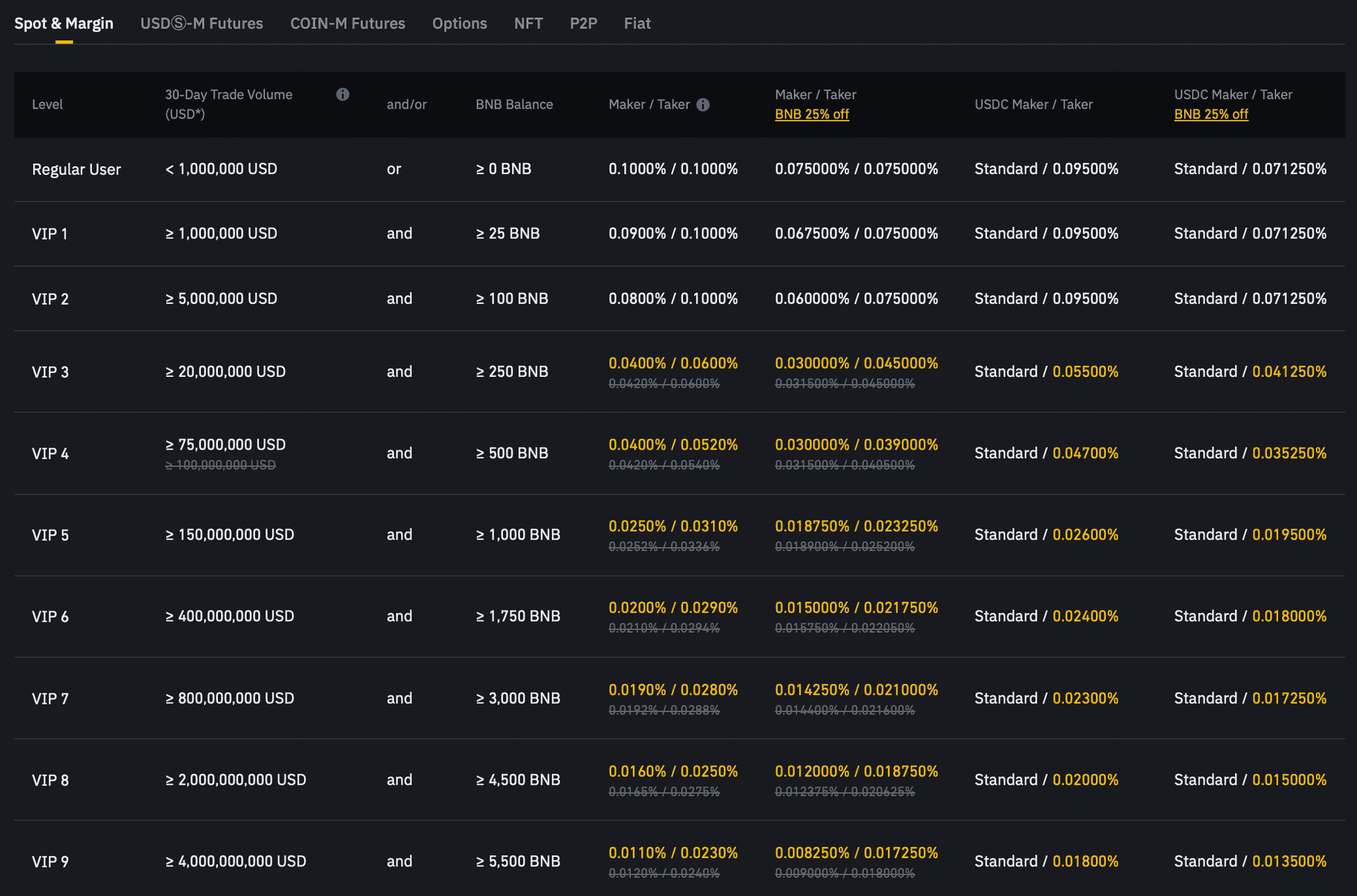 Binance has 10 tiers of accounts that are determined by VIP level. These VIP levels can be upgraded in two ways: Either by achieving a certain level of 30-day trading volume or by holding a certain number of BNB tokens. The higher the level, the lower the fees for trading. Here is a look at the tier structure: