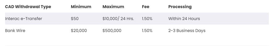 If you were going to be withdrawing your funds in CAD then the following fees would apply.