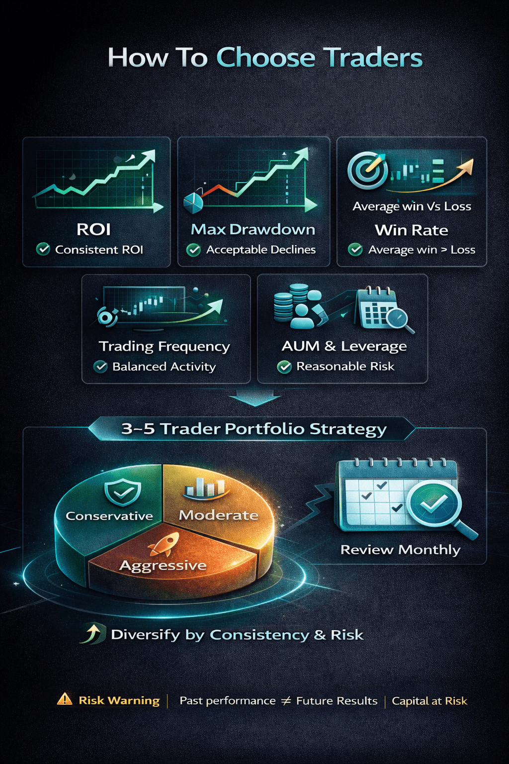 Picking who to copy is the real “strategy.” A trader with flashy returns can still be a bad fit if their risk profile does not match your tolerance. The goal is to choose traders whose style, risk, and consistency you can live with when the market turns ugly.