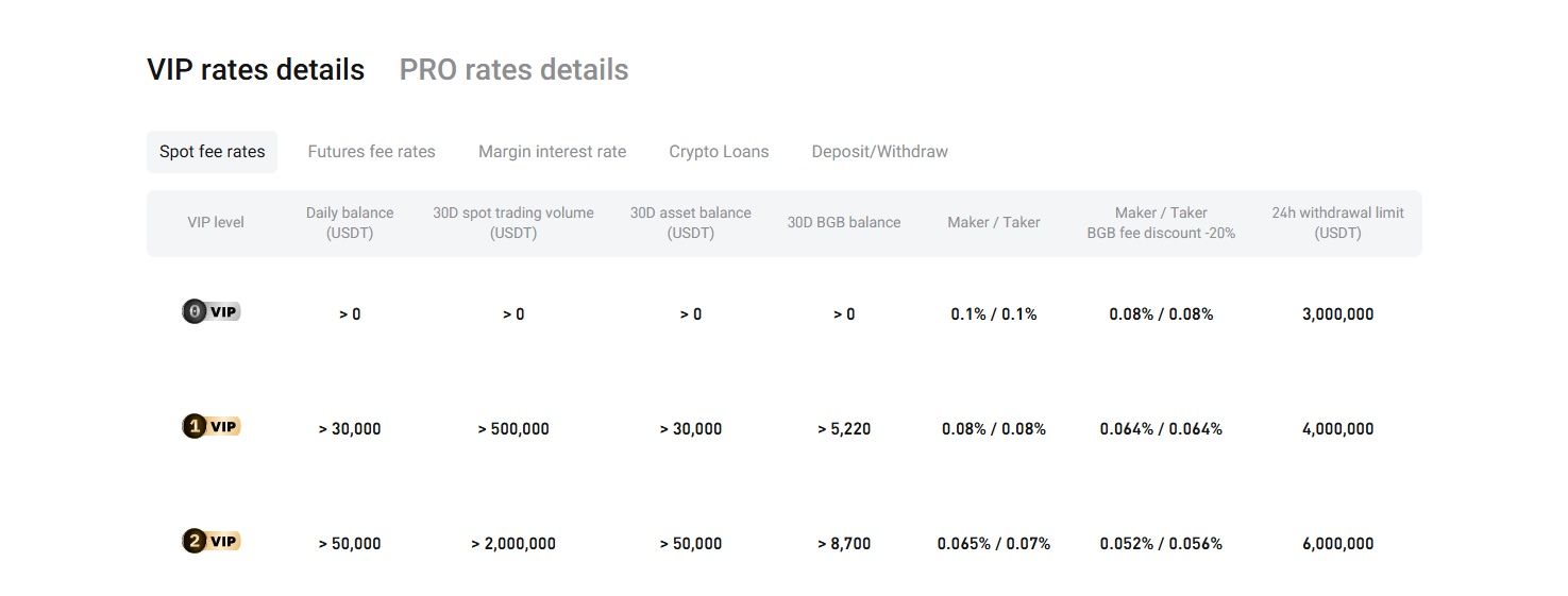 | Exchange | Spot (M/T) | Futures (M/T) | BGB/VIP Discounts |