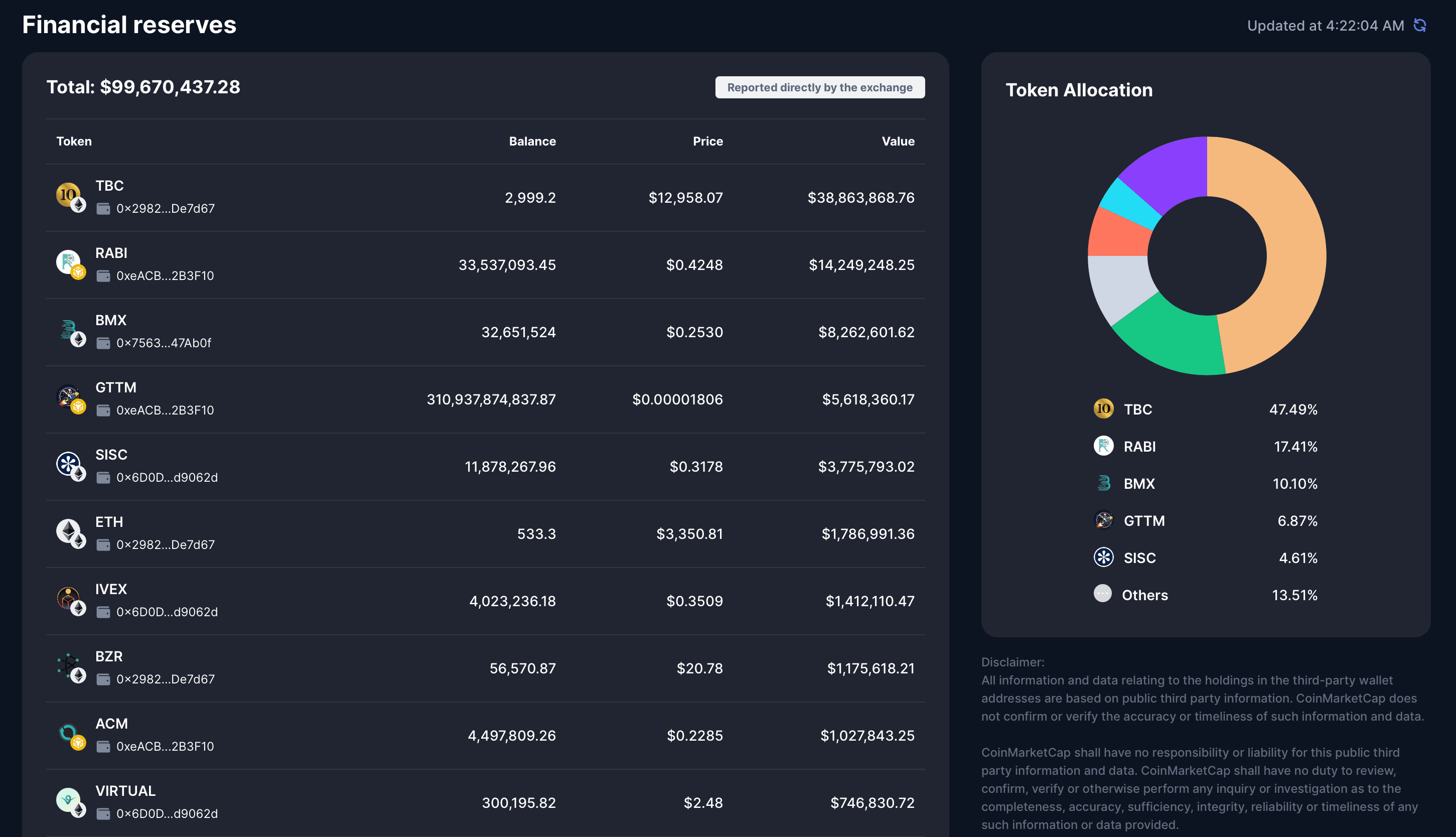 That said, BitMart falls short in offering transparent proof of reserves, allowing users to verify their holdings and access detailed audits, as provided by exchanges like Bybit and OKX. BitMart instead relies on self-reported proof of reserves through CoinMarketCap and discloses some of its hot wallet addresses. While the assurance that most assets are held in cold wallets is a positive step, the lack of fully verifiable proof of reserves is an area for improvement.