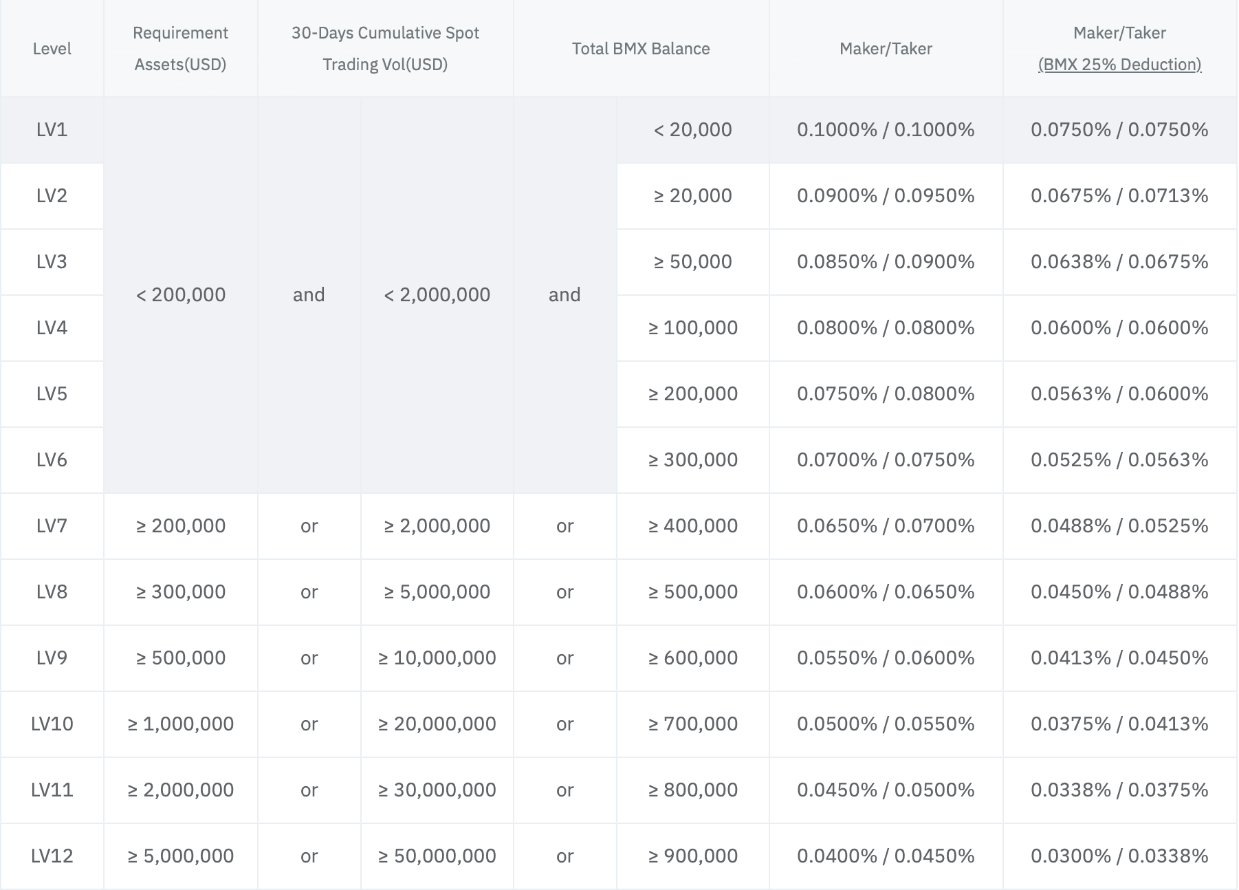 In addition to this categorization, BitMart also implements a tiered fee structure, where fees depend not only on the asset’s class but also on the user’s 30-day trading volume or asset balance. It’s important to note that this fee system applies only to spot trading fees.
