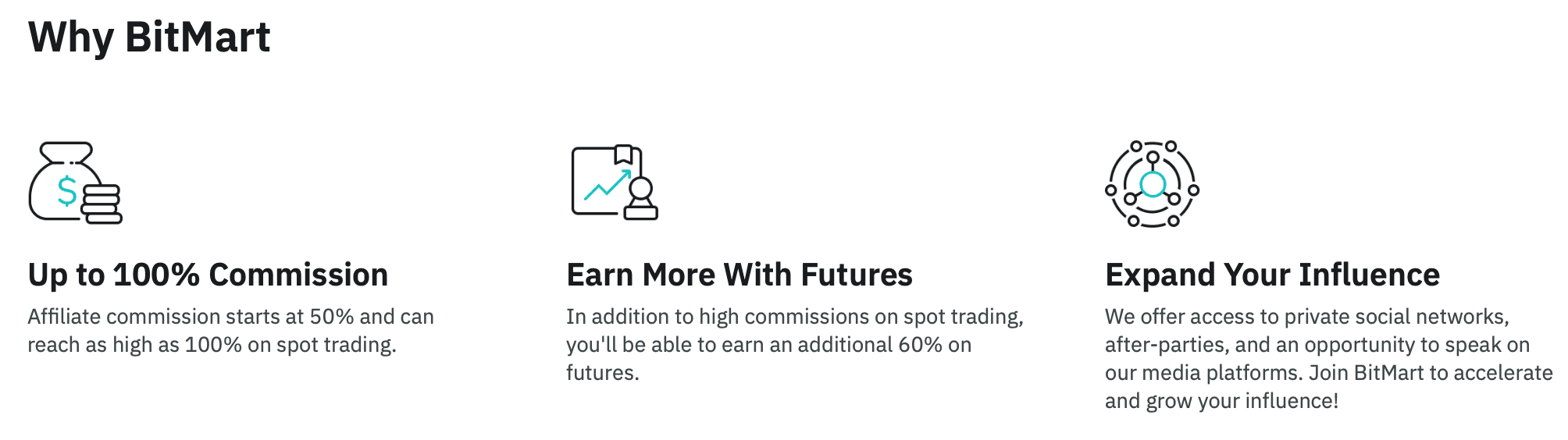 BitMart Affiliate Program Features. Image via BitMartCommission Tiers: