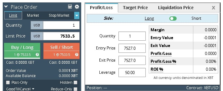 Below is a screenshot of the order form on the left. BitMEX also includes a handy calculator tool where you can work out your profit/loss given your target entry and exit levels.