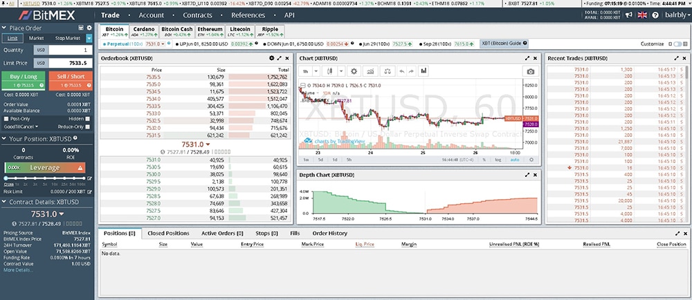 BitMEX Trading PlatformOnce you select a particular instrument, then it will open up on that market. What you are presented with is pretty typical for a cryptocurrency exchange. You will have the order books, charts, recent orders and positions.