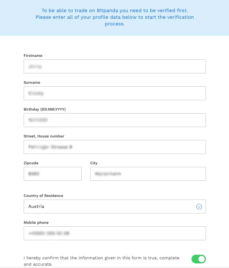However, before you can fund your account with fiat currency, you will need to get verified. Bitpanda will require you to complete their verification and KYC procedures. This is needed in order to combat money laundering and fraud.