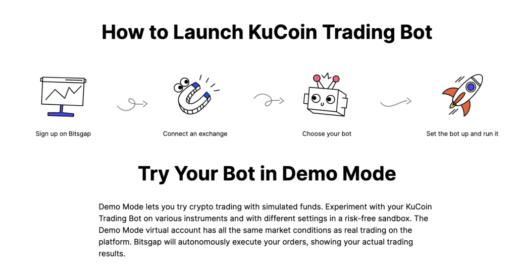 Bitsgap offers three different types of trading bots for KuCoin, which can be deployed seamlessly on the KuCoin exchange.