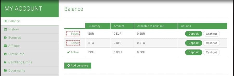 Quick and Easy Deposits and Withdrawals. Image via BitStarz - Every account defaults to Euros when created so the first thing to do is go to “My Account”, click on “Balance”, find the green “Add Currency” button and find Bitcoin in the subsequent list.