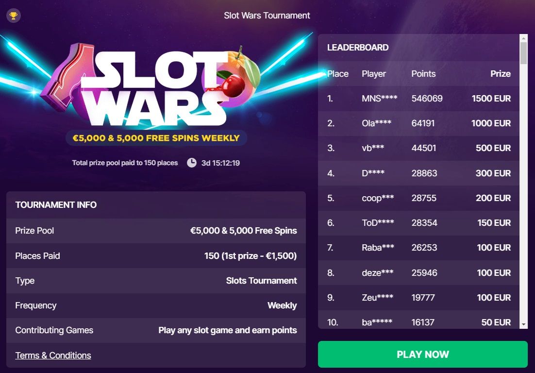 Those who play a lot of slots or are simply interested in seeing their positions can always track their progress on the Slot Wars leaderboards. Players generate points based on how much they wager, and the leaderboard is updated every minute.