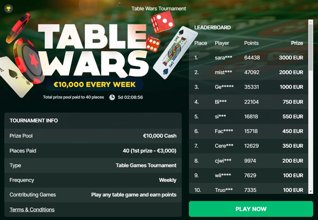 The second and third places aren’t too bad either, with those spots taking home €2,000 and €1,000, respectively. Table Wars points are generated across a wide variety of games, including blackjack, baccarat, and roulette.