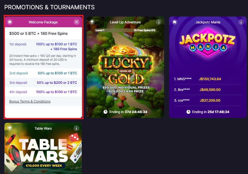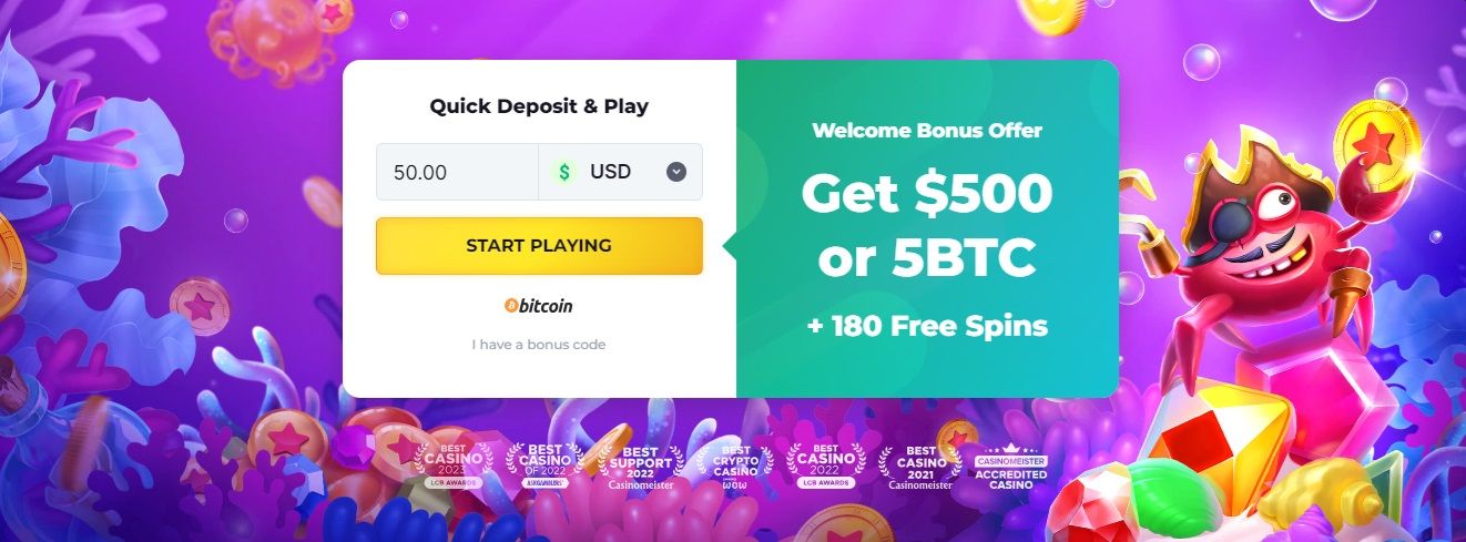 When signing up, you can get a welcome bonus. Currently, the company is offering $500 or 5 BTC, as well as 180 free spins — with strings attached, of course.