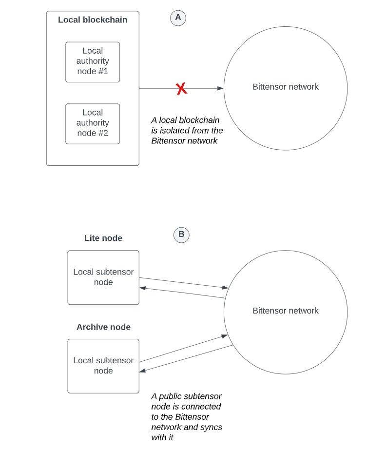 It's important to note that running a public subtensor node locally is not the same as running a local blockchain for development and testing purposes. A local blockchain is isolated from the Bittensor network and is used specifically for subnet incentive mechanism development and testing.