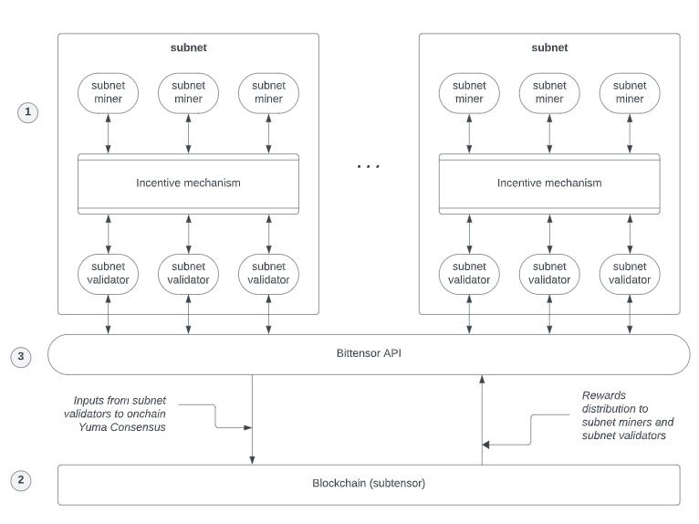 The blockchain, called subtensor, plays a crucial role in recording all the activity within each subnet and determining rewards for subnet miners and validators. An algorithm called Yuma Consensus (YC) runs on the blockchain, computing rewards for miners and validators based on their performance every 12 seconds. These rewards are then deposited into their wallets in the form of TAO tokens.