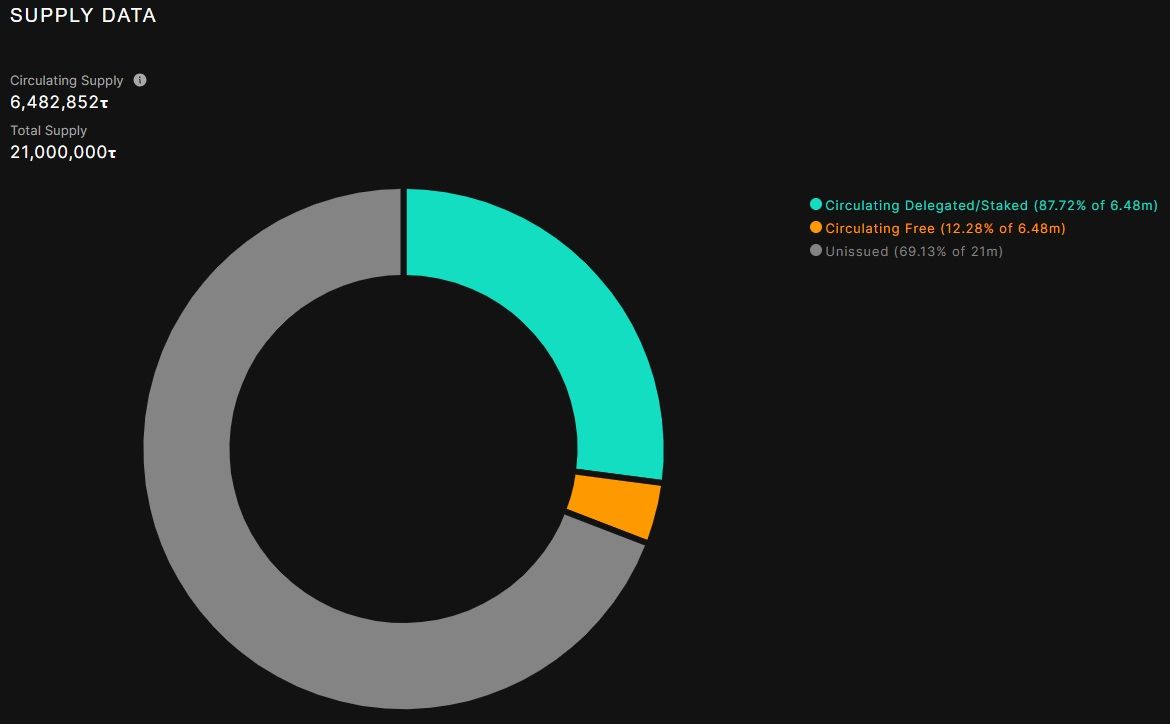 Similar to Bitcoin, TAO Has a Maximum Supply of 21 Million. Image via TaostatsThe total supply of 21 million TAO tokens is hardcoded into the system. A new block is mined approximately every 12 seconds, rewarding miners and validators with 1 TAO per block. According to the current inflation schedule, this results in 7,200 new TAO being introduced into circulation every 24 hours, evenly split between miners and validators.