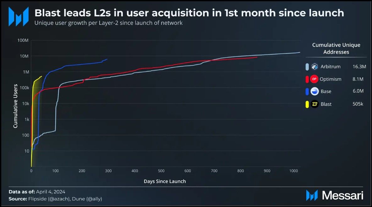 Blast Incentive Scheme Attracts Significant Users | Image via MessariThis comprehensive and multi-dimensional incentive strategy has successfully rapidly scaled the Blast ecosystem, attracting significant liquidity and users.