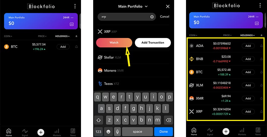 Adding new Coins to Blockfolio WatchlistNow you can head back to your home screen and you will see all of the coins that you have just added to your watchlist. The watchlist will give you a quick summary of the coins price and daily performance. You can also arrange your watchlist by coin, price and the amount that you hold.