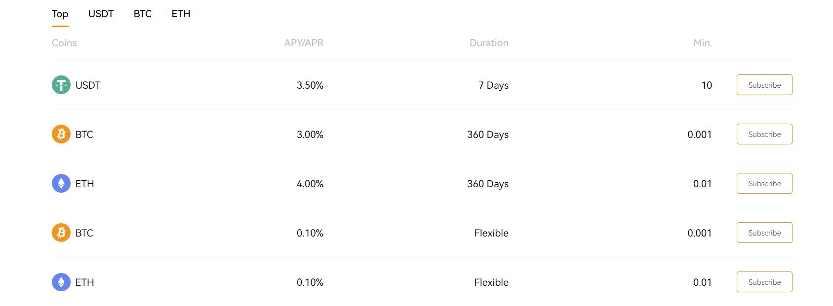 - BTC: Provides a 3.00% APY for a 360-day lock-up, requiring a minimum of 0.001 BTC. This long-term option offers substantial returns but requires a full-year commitment.