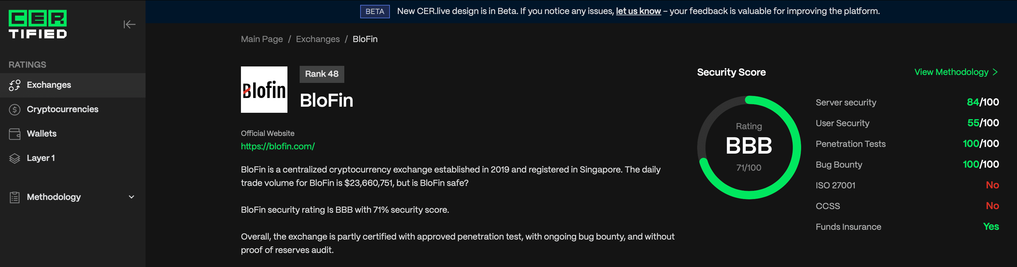 BloFin has implemented several comprehensive security protocols to safeguard user funds and ensure compliance with regulatory standards. According to CER.live, which evaluates crypto exchange security, BloFin scores 71/100, earning a BBB rating and ranking 48th in security among exchanges.