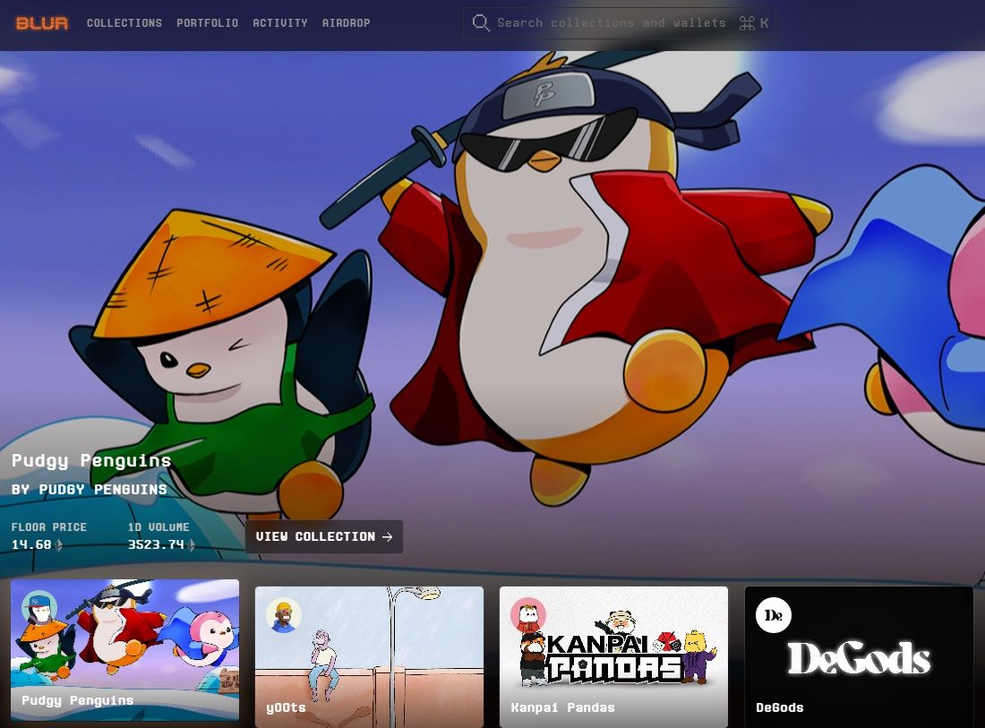 Blur is an NFT marketplace that offers a streamlined experience free of clutter and distractions. Here, you'll find only the finest NFTs alongside relevant statistics, without the need to sift through countless pages of questionable listings or distracting banners.