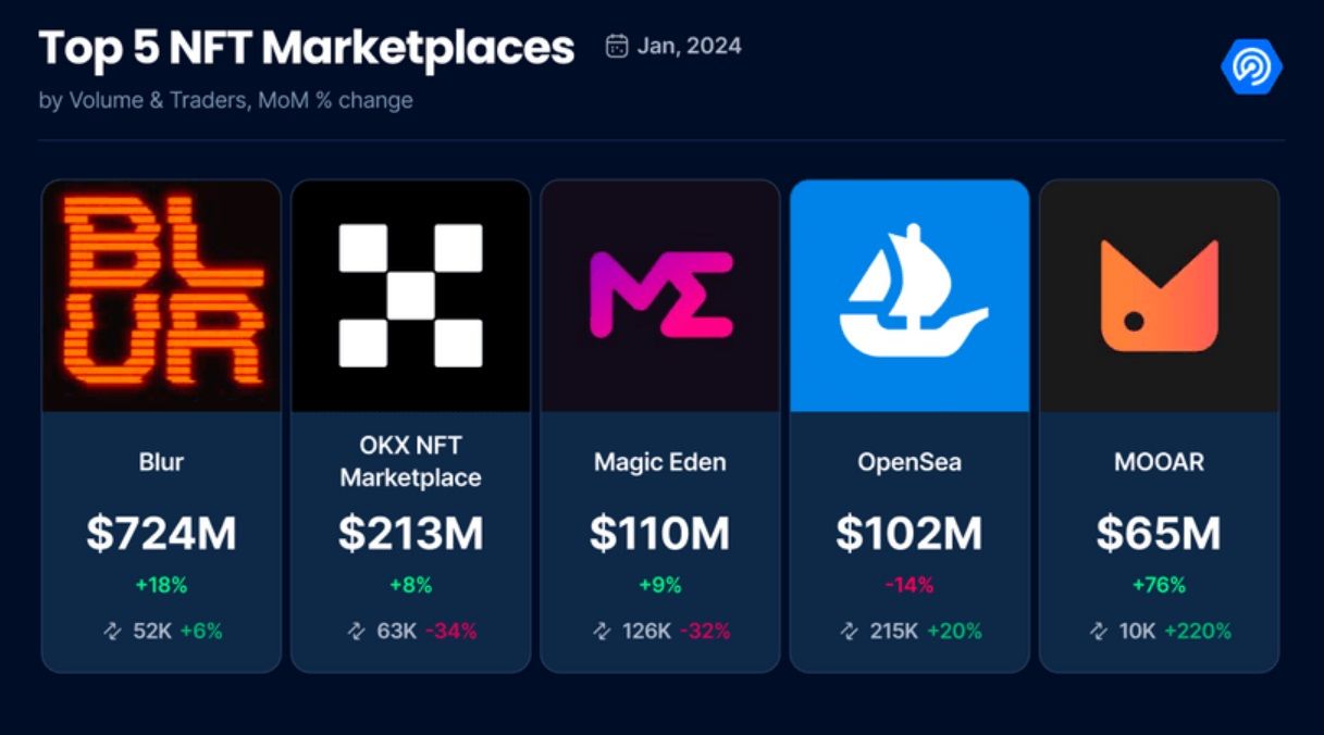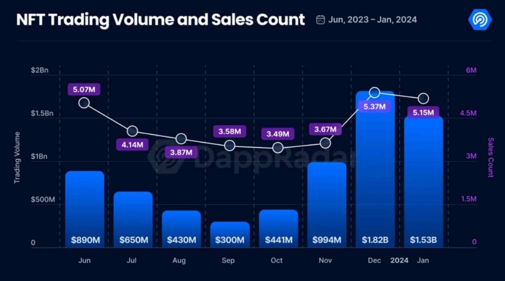 The NFT market has been witnessing a notable resurgence in recent months, and this upward trajectory persisted into January, with a reported trading volume of $1.5 billion, according to DappRadar. While the figure reflects a 16% decline from December 2023, it is still indicative of substantial activity within the space.
