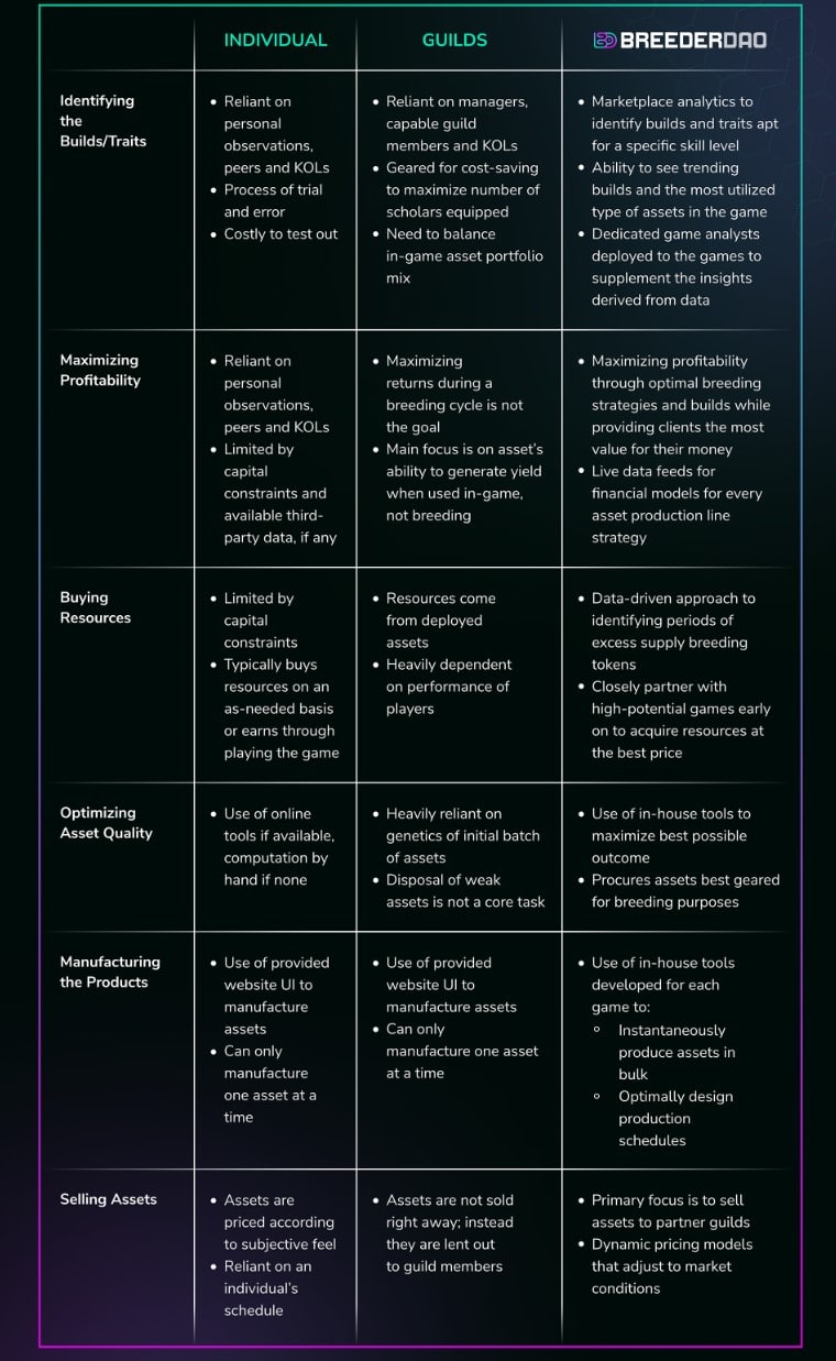 BreederDAO has created the table below that outlines the key aspects of the breeding process and the varying methodologies in which individuals, guilds, and production teams like BreederDAO approach each aspect: