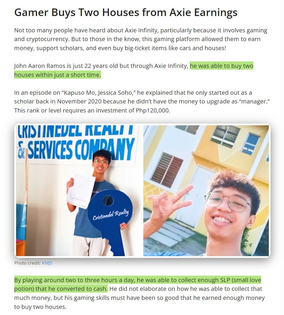 The formation of gaming guilds has also provided opportunities to many people in developing nations, allowing everyone to get involved and capitalize on Play-to-Earn gaming. For many, blockchain games like Axie Infinity have become more than just a game; it has become a life raft and a way to make a living.