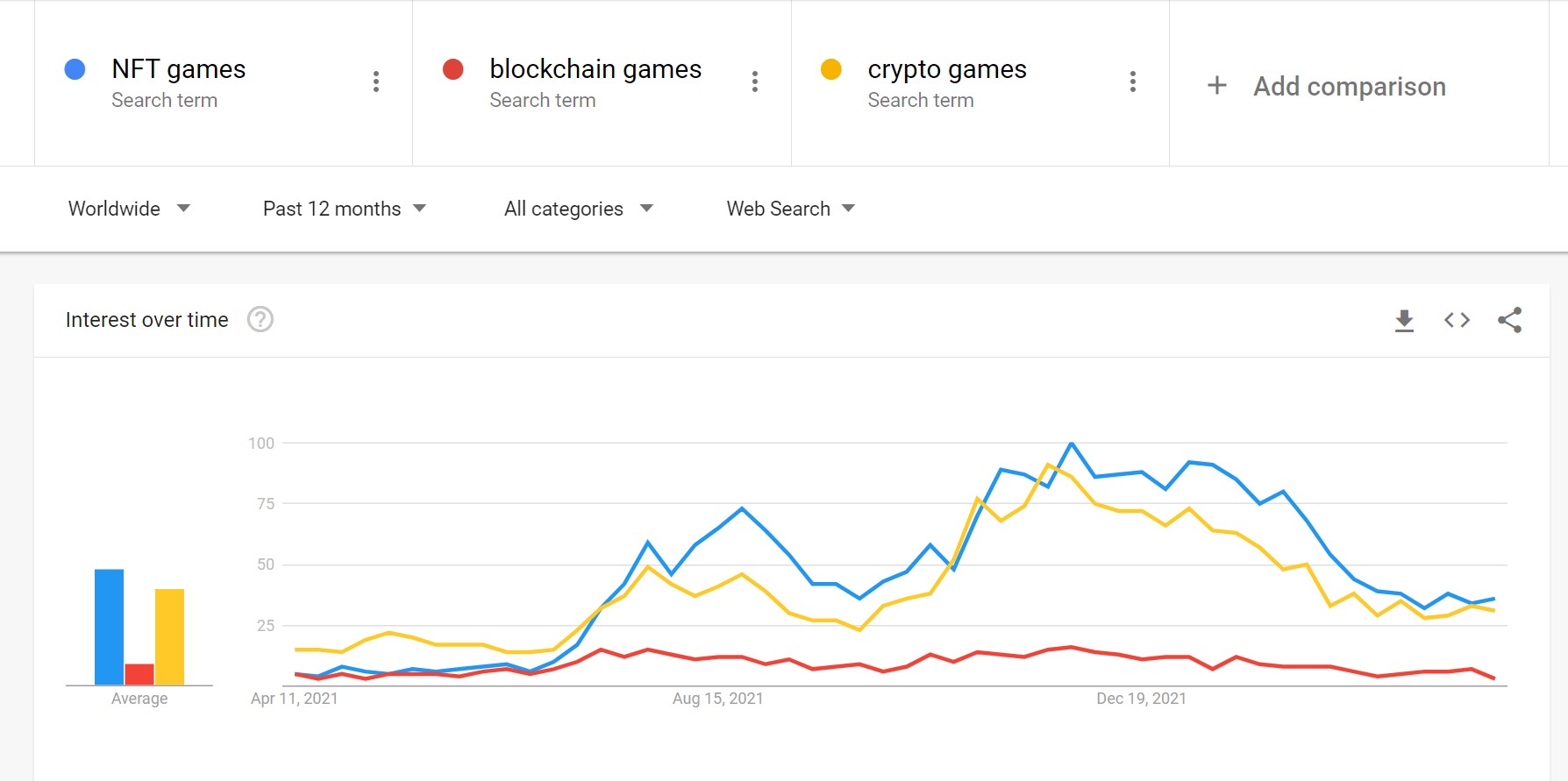 Using Google Trends, we can see the uptick in search volume for NFT, Blockchain and Crypto-Games.