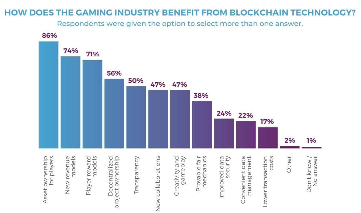 In-game asset ownership and making money aren't the only reasons players choose NFT games over their non-blockchain counterparts. According to a 2021 survey from the Blockchain Gaming Alliance, here are the primary ways in which gamers feel Blockchain technology can benefit the gaming industry: