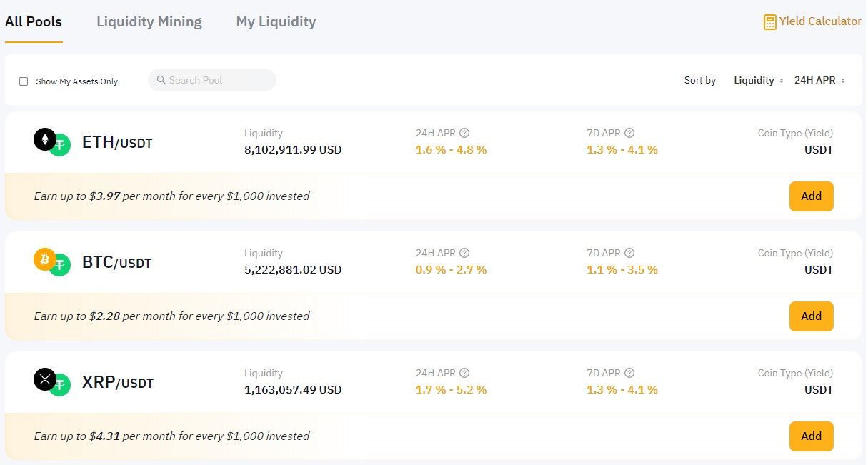 Bybit Liquidity Mining Features a Number of Liquidity Pools. Image via BybitYou can add liquidity to a pool to become a liquidity provider and earn yield derived from swap fees in the pool. You can also add liquidity to increase your share in the pool, grab additional liquidity, and amplify your yield. If you decide to add leverage, you should be aware that it may entail liquidation risks.