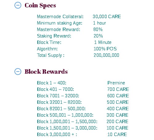 According to the Carebit protocol, by block 400 the algorithm will switch from a PoW model to a Proof-of-Stake (PoS) based consensus algorithm. This is where members of the community who "stake" their coins will be allowed to verify the transactions. Below is the block rewards that the miners will get when they are firstly operating through POW and then through POS. The maximum amount of CARE tokens that will be available on the market is set to 200m.