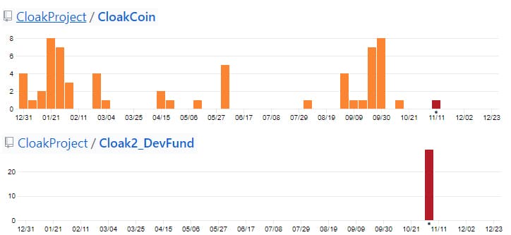 In order to get a good sense of how much work is being done by the team, it helps to take a look at the project's GitHub. The number of commits that a project has been making is able to give us a rough indication. Taking a look at the CloakProject repository, we get the below overview.
