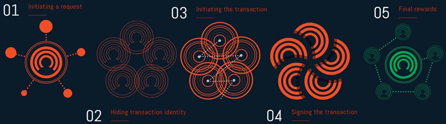 Cloakcoin has CloakShield, which is an onion type protocol, enabled by default to provide end-to-end encryption and secure communications for every transaction. This technology alone allows nodes to avoid any analysis of the traffic routed through them. However at the next level of privacy and anonymity is ENIGMA. This technology uses as many as 25 hops with symmetric RSA encryption and an ECDH key exchange.