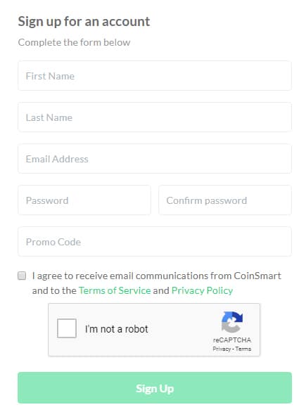 If you have decided that you would like to give Coinsmart a try then you will need to signup and create an account. They will need your full name, email, password as well as any promo code (more on this in the referral section).