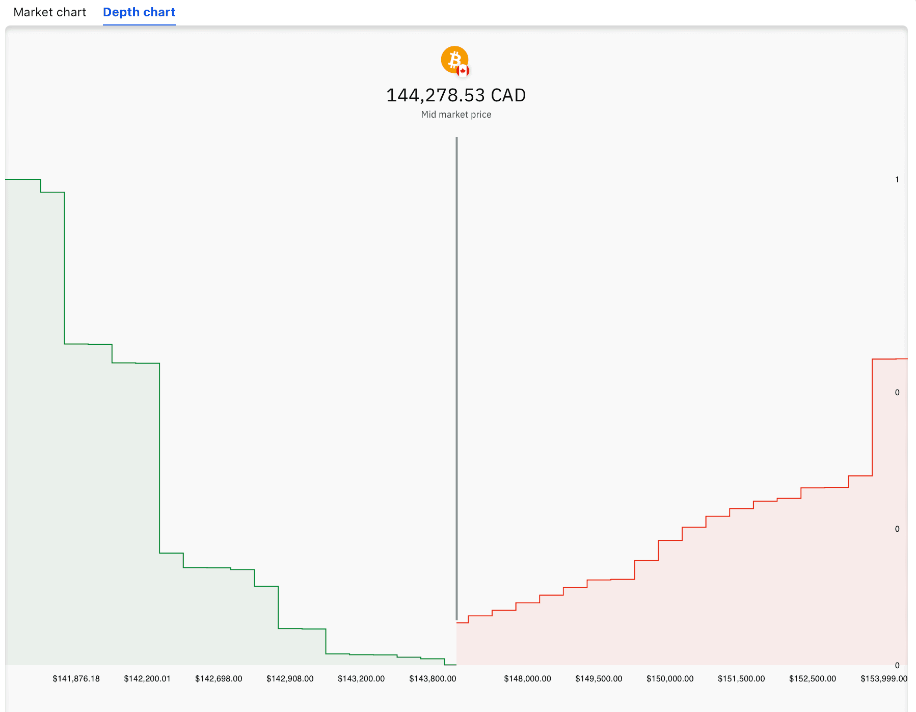 Moving back to the platform, you can also toggle between the price chart and the depth chart. The depth chart is a handy indicator which gives traders an idea of how the order books look. It allows one to ascertain the liquidity in the market and where sentiment is heading.