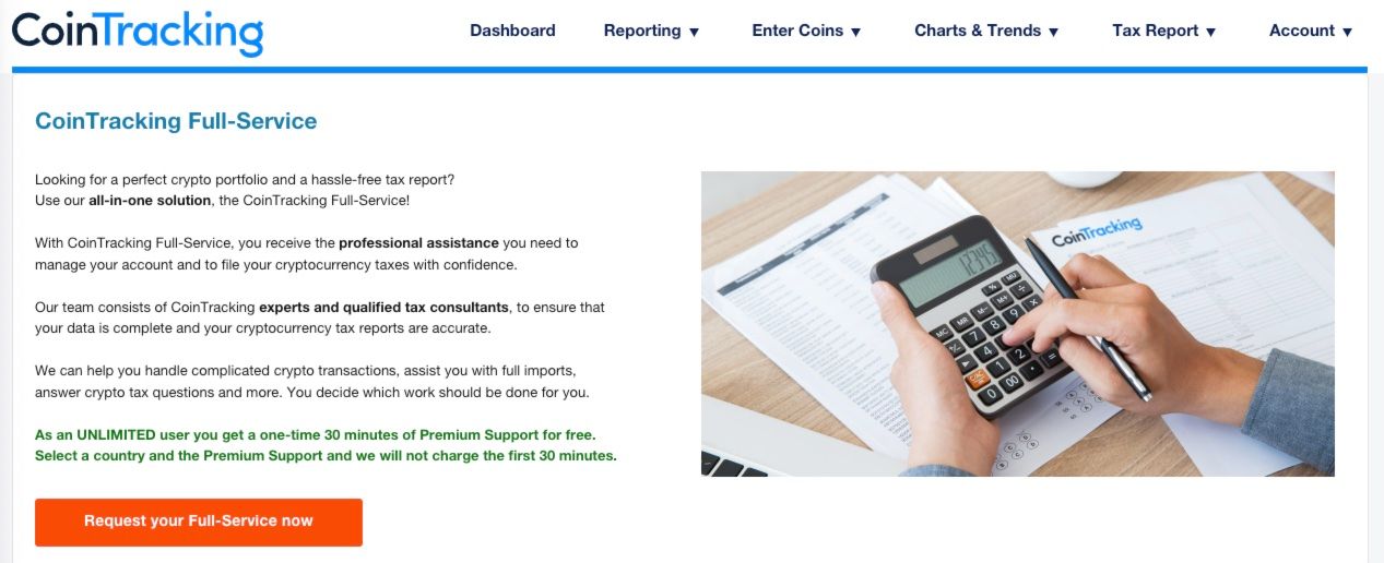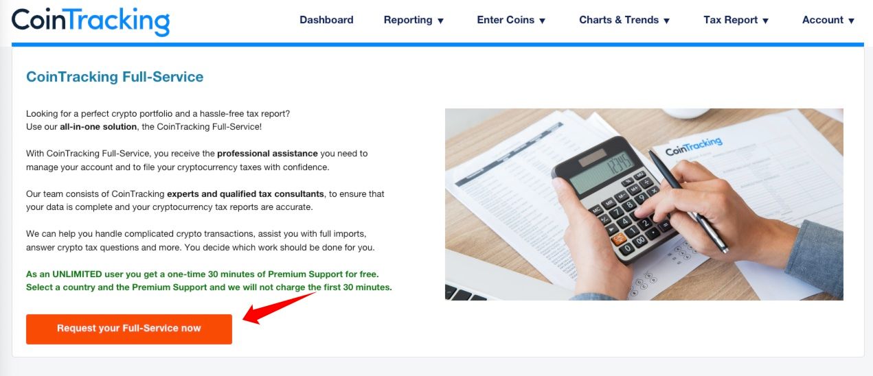 The first thing you’ll need to do is head over to CoinTracking and hit the “Request Your Full-Service Now” button.